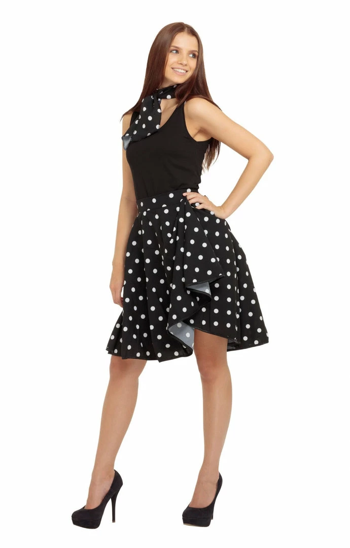 Ladies 1950’s Rock n Roll Skirt Black and White Polka Dot This long black and white polka dot skirt is great to get you into the rock and roll mood! Includes skirt and neck scarf.