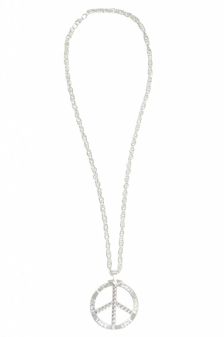 This 1960’s silver-coloured, peace sign medallion boasts love, peace and hope script and has faux diamante detail down the centre. Perfect for festivals and 60’s themed fancy dress parties.