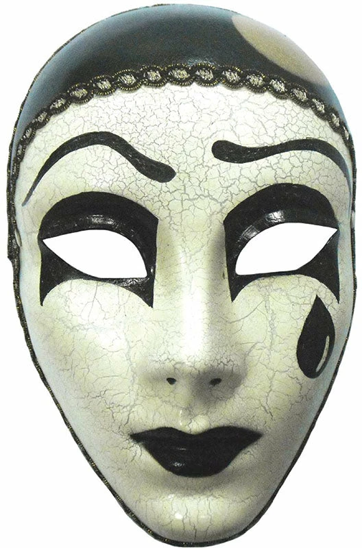 Mime Mask With Tear This black and white Pierrot Mask is a molded mask and covers the entire face. A stunning addition to your Masquerade or Mardi Gras costume.