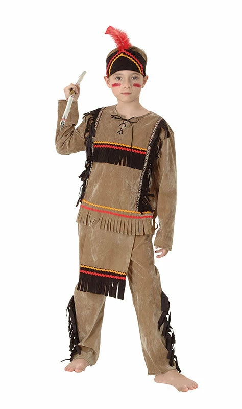Fight like a brave! This boys Indian Brave costume includes a brown velour top with fringe detailing and with lace up neckline. Also included in this Native American costume is a pair of matching trousers with an attached apron and an Indian headpiece with feather. You’ll be out roaming the plains before sundown. Ideal costume for Cowboys & Indians or western theme fancy dress