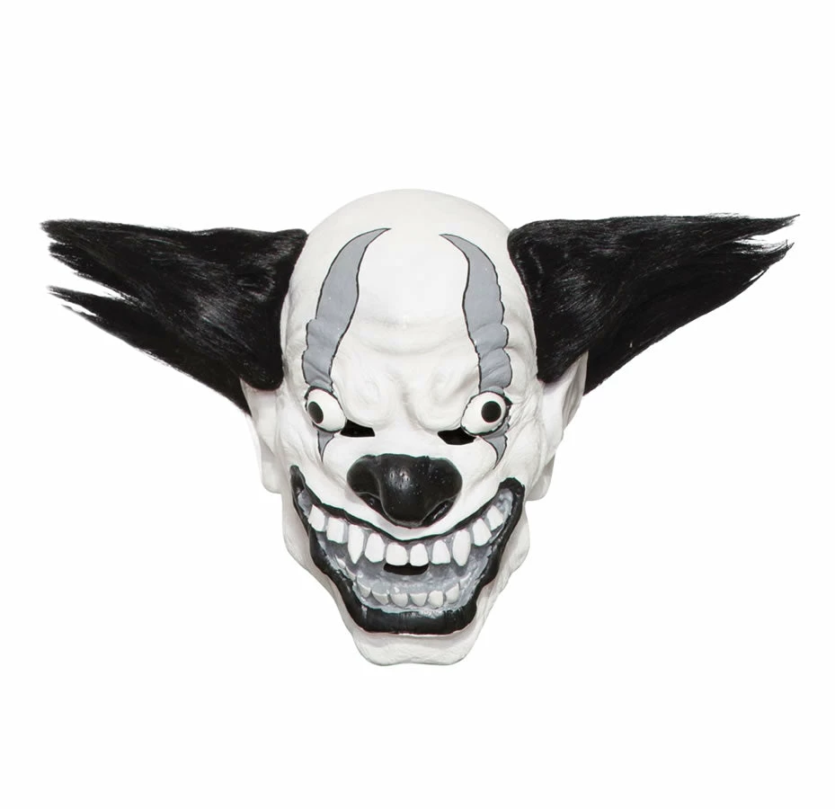Give all the kids on the block nightmares when they come trick-or-treating to your house with this Evil Clown Mask! This latex mask is designed to look like a clown face with white makeup, black designs around the eyes, crazy grin, and puffs of black hair on the head. Bring some twisted carnival fun to your next Halloween party.
