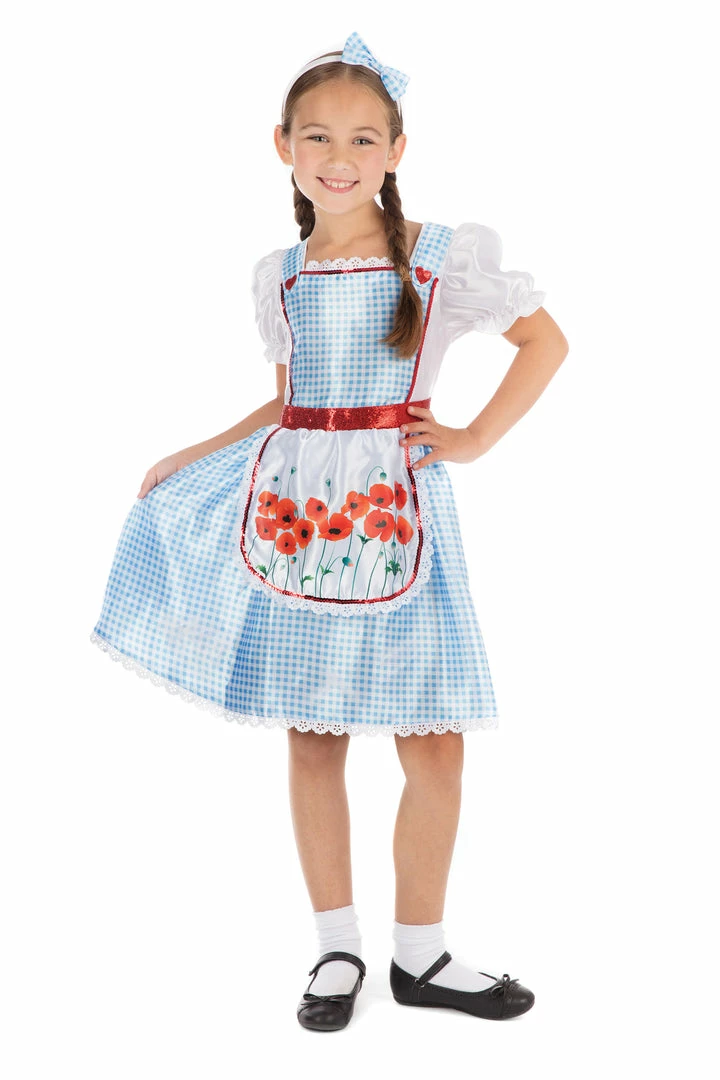This stunning children’s fairytale girl’s Dorothy outfit comes complete with a Blue and White checkered print dress with attached White Puff Sleeves and Poppies Printed on the Apron. The Apron also has attached Red Embroidered Sequins to finish off the look. There is also a Headband included with an attached checkered bow to finish off the look.