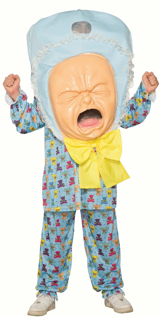 Our funny Big Baby Costume features an oversized baby blue bonnet, a gigantic hat head depicting a screaming and crying baby, a pair of baby blue pajama bottoms with colorful bears on them, and a matching pajama top.