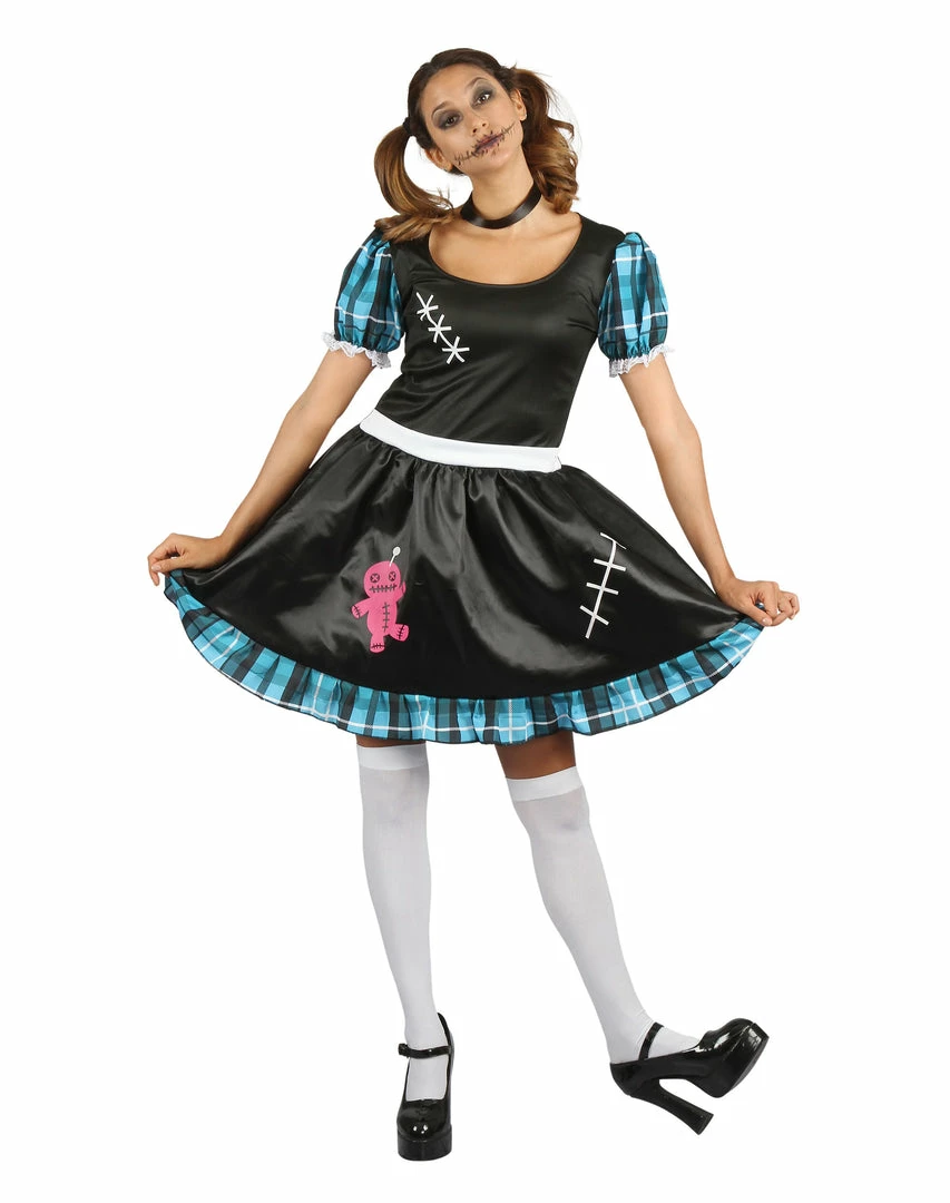 A nice blend of cute and creepy this outfit comes complete with a Voodoo Styled Dress with Puff Sleeves and matching Black Choker.Â