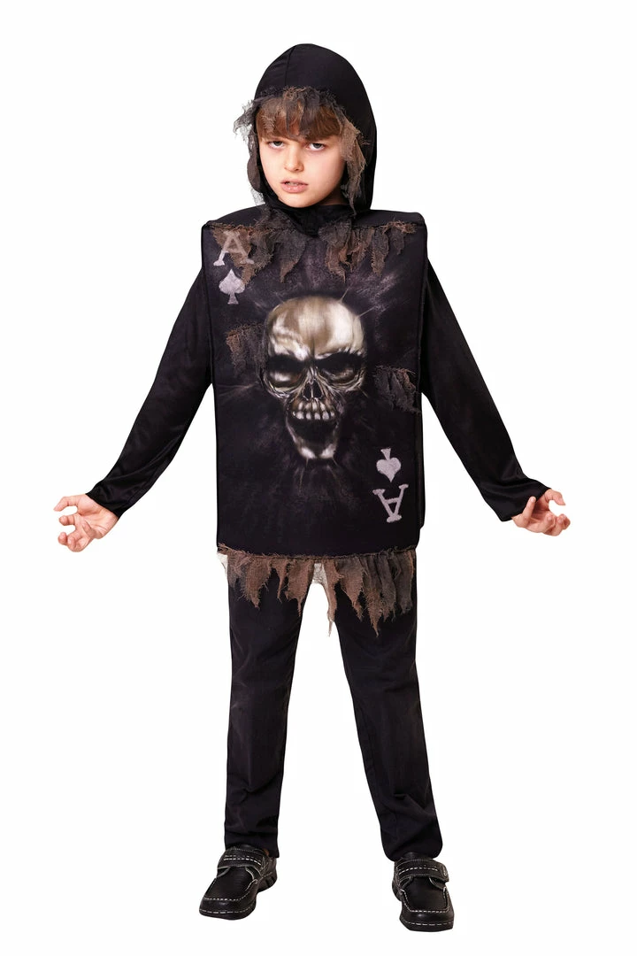 Terrify your neighbours, family and friends in this playing card Skeleton Boy costume. This creepy outfit is a tabard in the style of the Ace of Spades with shredded edges and skull design on the front with matching shredded hood.