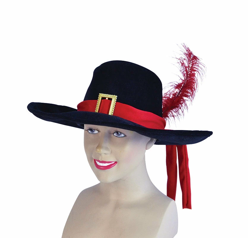 Our fancy Black Red Velvet Musketeer Hat is great for Halloween, costume parties, other dress up events or even theatre props. Made from soft velvet like material, this hat comes complete with red feather decoration and long red hat band. This red hat band that is featured with gold buckle is wrapped around the crown of hat and brim of hat is slightly up turned. Have some fun and express genuine pirate costume outfit in this awesome musketeer, pirate and cavalier hat. Made of 100% polyester.