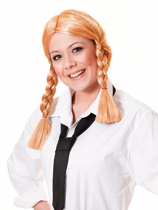 Blonde Schoolgirl Wig With Pigtails. Ideal for a school girl costume or outfit! Could also be an alternative wig for Annabelle from the Conjuring. Just add red bows to bottom