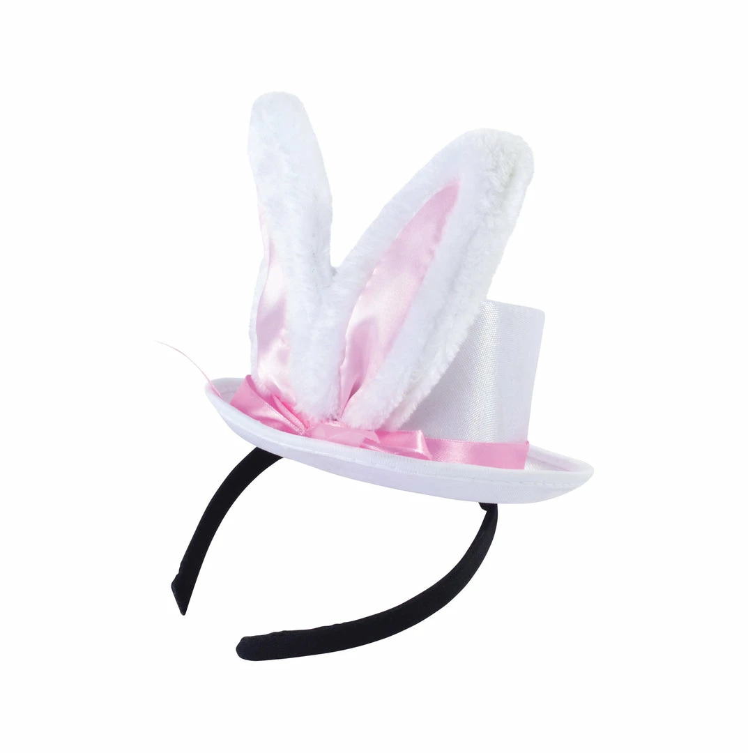 Perfect for any Alice in Wonderland party as the White Rabbit or even a hat party. This cute white mini top hat with a pink ribbon edging and bunny ears attached to a black headband.