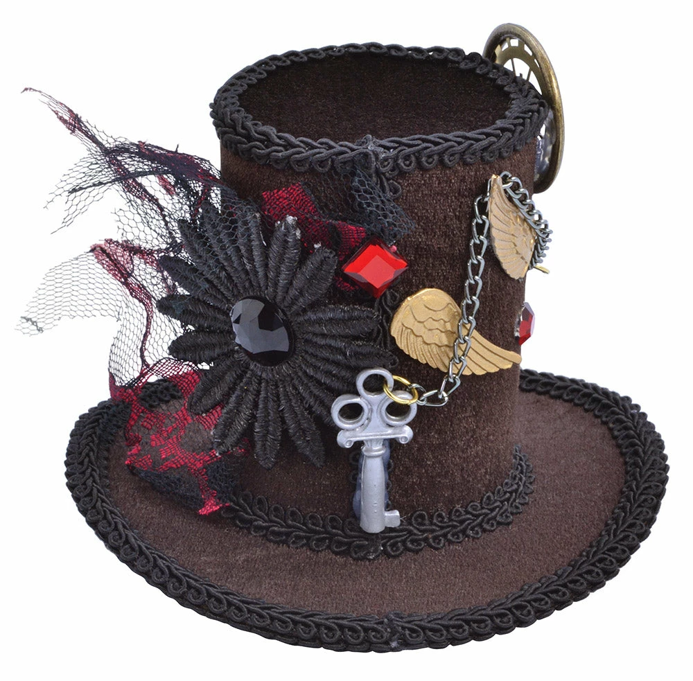 This hat has a brown velvet-look material, dark brown embroidery detailing around the rims and has gold applications featuring a gearwheel with attached a chain and a silver key and golden wings. Red gem detailing and black embroidered flower complete the hat’s decoration. The hat is easy to wear and a good grip is assured by two hidden hair clips.