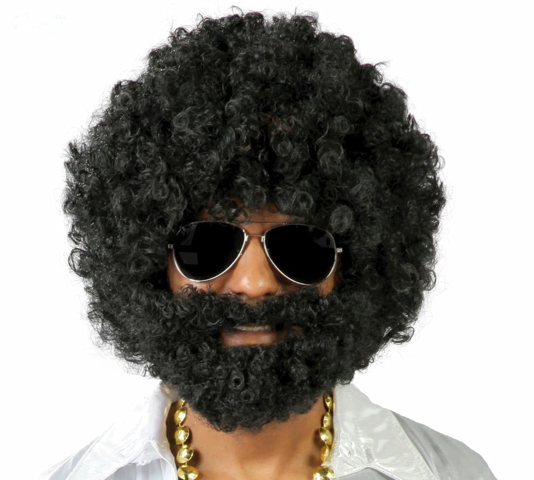 Black curly afro wig and beard set to add the finishing touches to any 1970’s outfit. The wig features an attached wig cap to hold the wig securely onto your head and to stop any stray hairs that might give away the look.