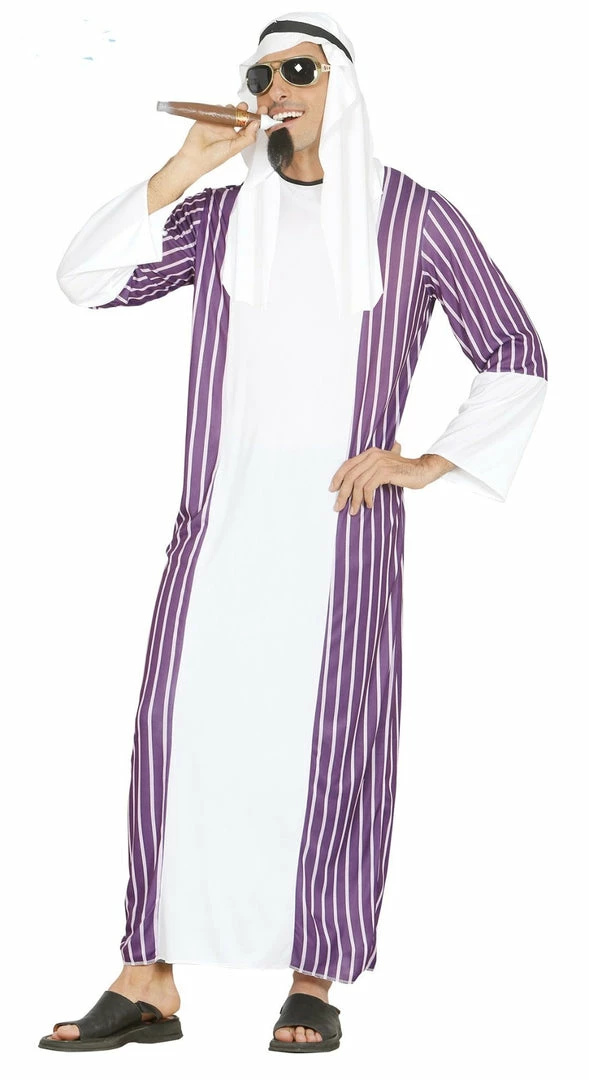 The costume contains everything for turning yourself into a chic Sheikh and comprises of a long white and purple robe with a matching headpiece.