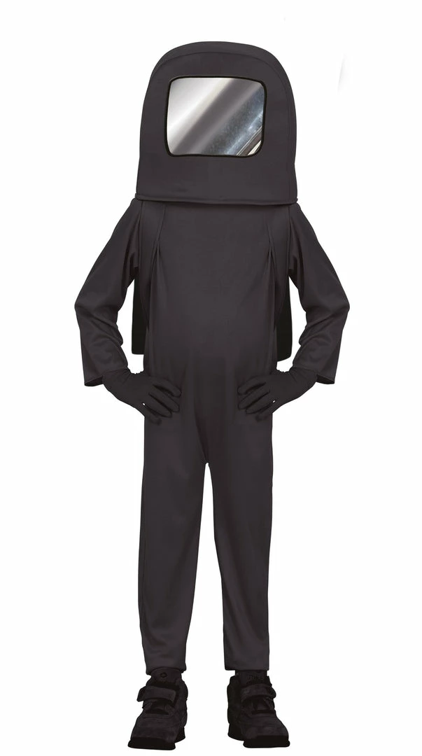 The kids Among Us outfit has a see through mirror face shield helmet, suit with attached backpack for carrying things, which all combines to give them that iconic pill shape.