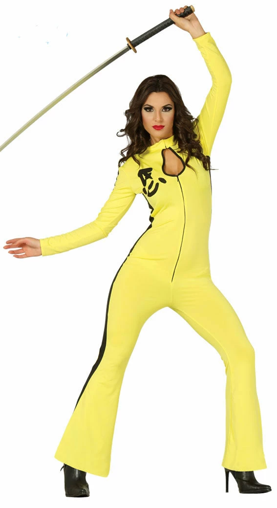 This Kill Bill outfit is perfect to recreate Beatrix Kiddo’s costume from the deadly duel scene between Uma Thurman’s character and Oren Ishii. This jumpsuit costume is bright yellow top that has black stripes down sides and along each sleeve. The entire ensemble fits together to create an iconic kung-fu outfit that may have you feel confident enough to take on the entire Crazy 88 gang solo.