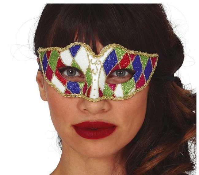 This striking colourful glitter masquerade mask is cleverly decorated with criss-cross colours creating a Harlequin effect, intricate gold detailing. Gold braid trim finish this venetian style eye-mask.