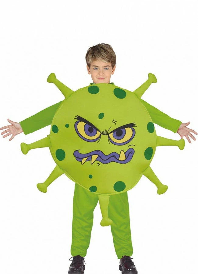 This coronavirus costume is lime green with spikes peeking out of the costume and dark green printed holes. There is an evil face printed in the centre with purple lips and eyes with dirty yellow pointy teeth.