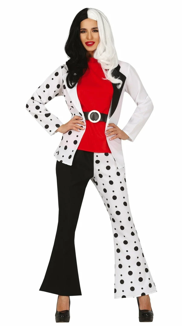 This costume is a dalmation fashion statement with it’s fantastic mix of blacks and white. It comes with a suit style jacket, trousers and high neck shirt.