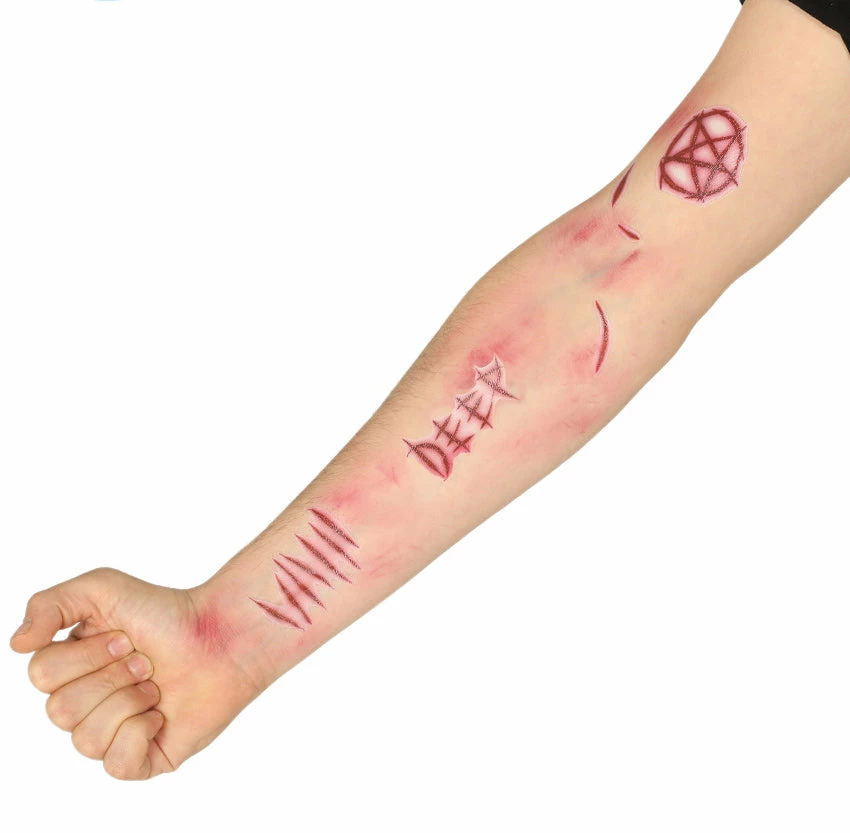 These Cuts Temporary Tattoo’s will give you grisly stitched-up injurys without the hassle of actually getting hurt. With red lacerations, these gory temporary tattoos can be applied anywhere on your body. This single sheet features easy to apply (and remove) temporary tattoos that depict cut or carved flesh wounds. Temporary tattoos are easily applied with water and can be removed using baby oil or rubbing alcohol.