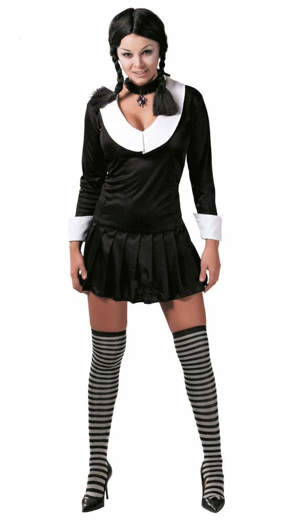 This costume has a white collar with black spider motif and white cuffs. This black dress outfit is a take on the classic The Addams Family character and consists a low cut top and attached pleated skirt. Add white tights, a black plaited wig and scary make up to complete the look.