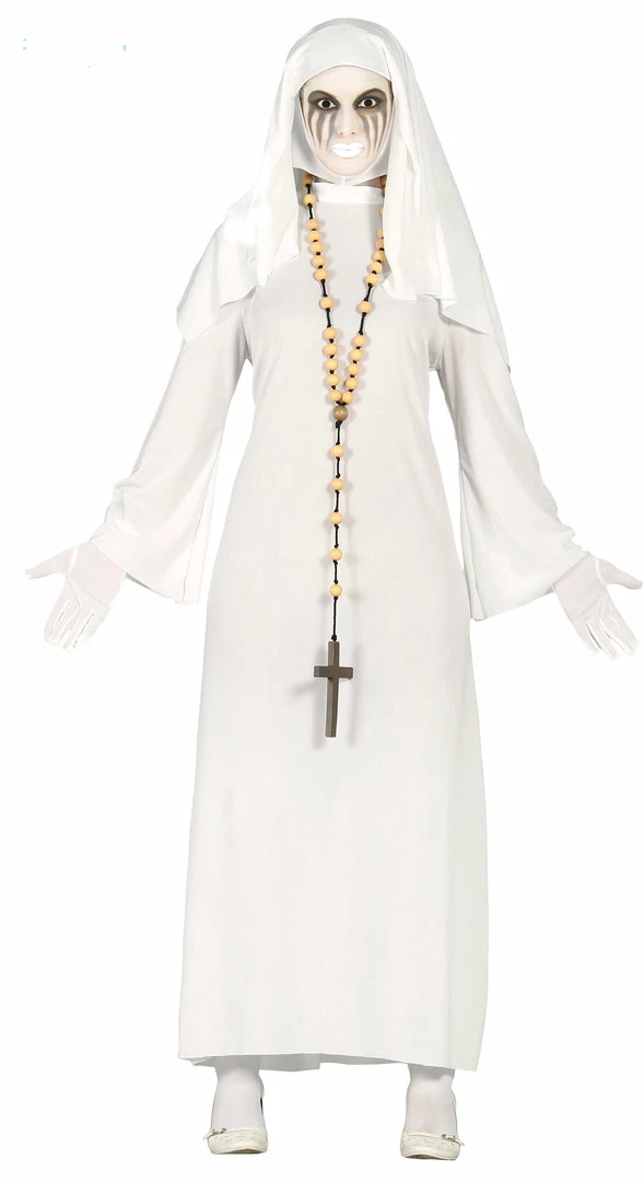 Haunt everybody at the costume party as a creepy white nun from American Horror Story Asylum. The creepy nun outfit features a white gown and habit. This costume can be finished with some white face paint and fake blood for tears.