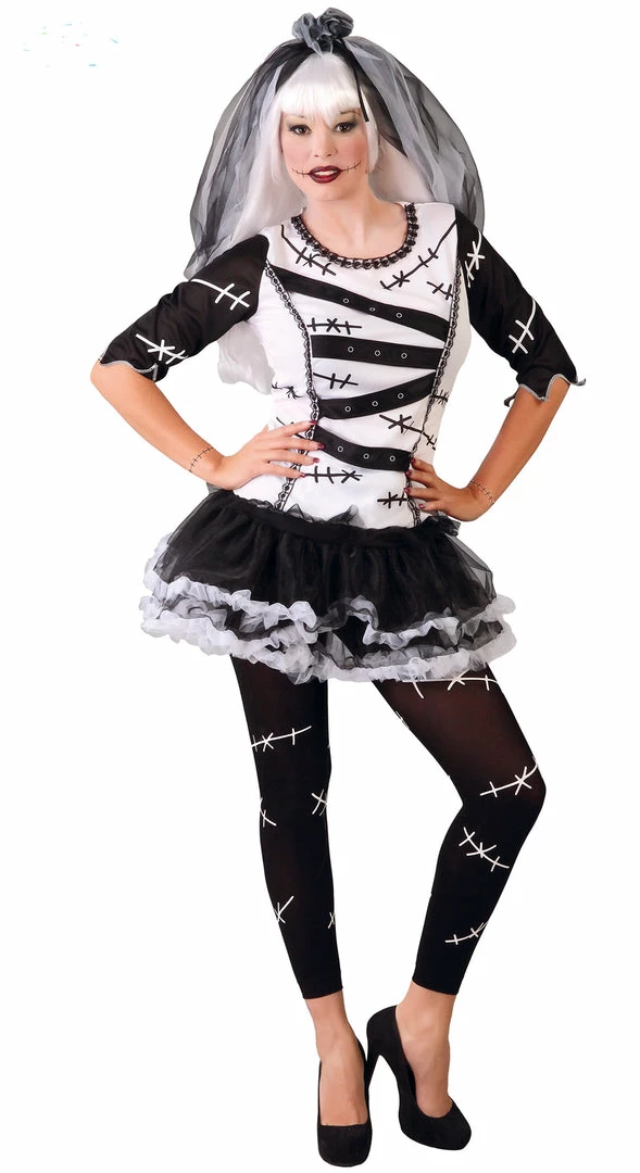 This woman’s Halloween Monster Bride outfit comes with a black and white top with stitch detailing, a tutu style miniskirt with white tulle edging and a black and white veil. Tights and bouquet are not included.