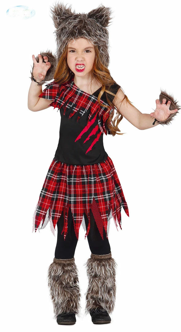 This girls werewolf outfit features a pretty tartan dress comes with a wolf hood, gloves and legwarmers.