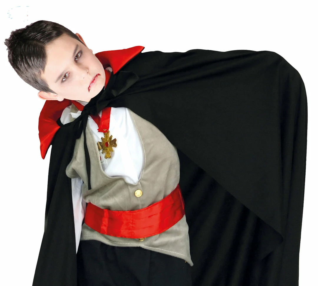 This gorgeous black cape with red lining and stand-up collar is the perfect accessory to complete your child’s Count Dracula or Vampire costume this Halloween.