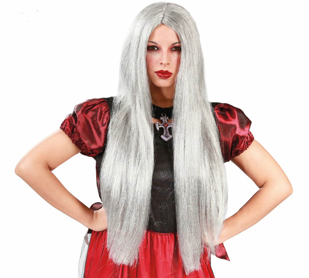 With this ladies long straight grey haired wig, you can be an old woman, Banshee, wicked witch, ghoulish zombie or even a vampire queen.