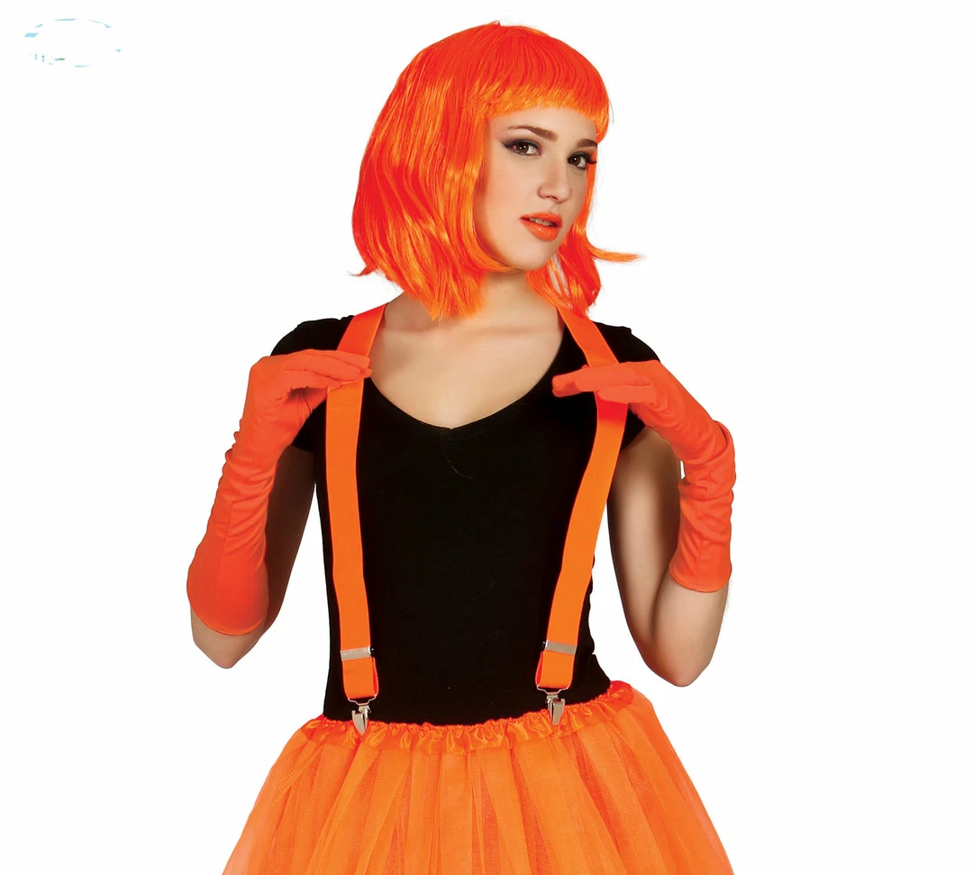 Neon Orange adjustable braces for use with trousers, skirts tutus or even as a fun 1980’s costume accessory. The Braces have elasticated straps and three metal clasps.