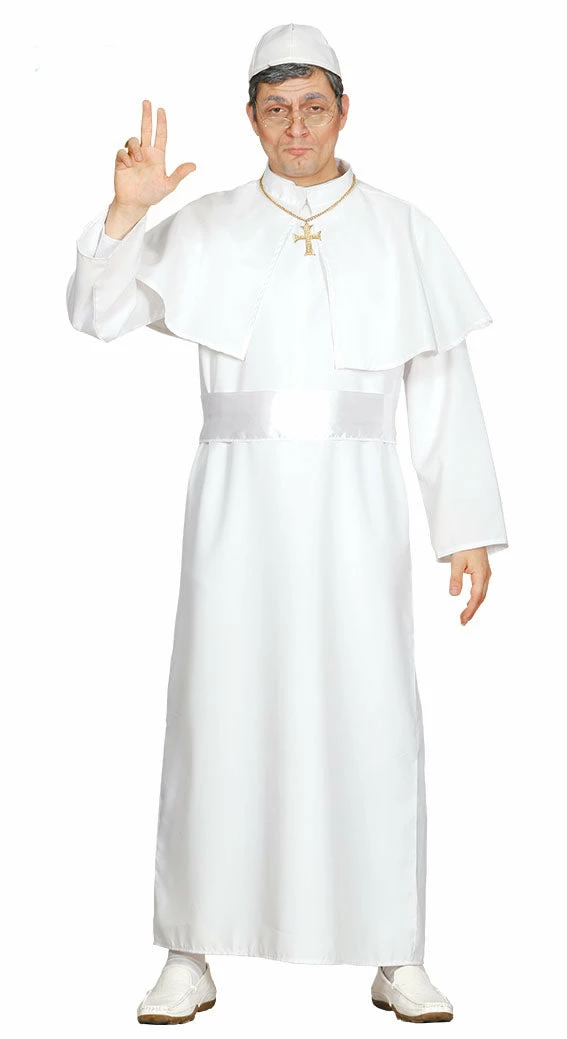 Turn your fancy dress party into a holy event with our Pope Costume. Perfect for any religious themed parties or stags. The costume includes a full length, long sleeved white papal robe white belt, white capelet collar and white papal cap. Just add a gold cross to complete your look!
