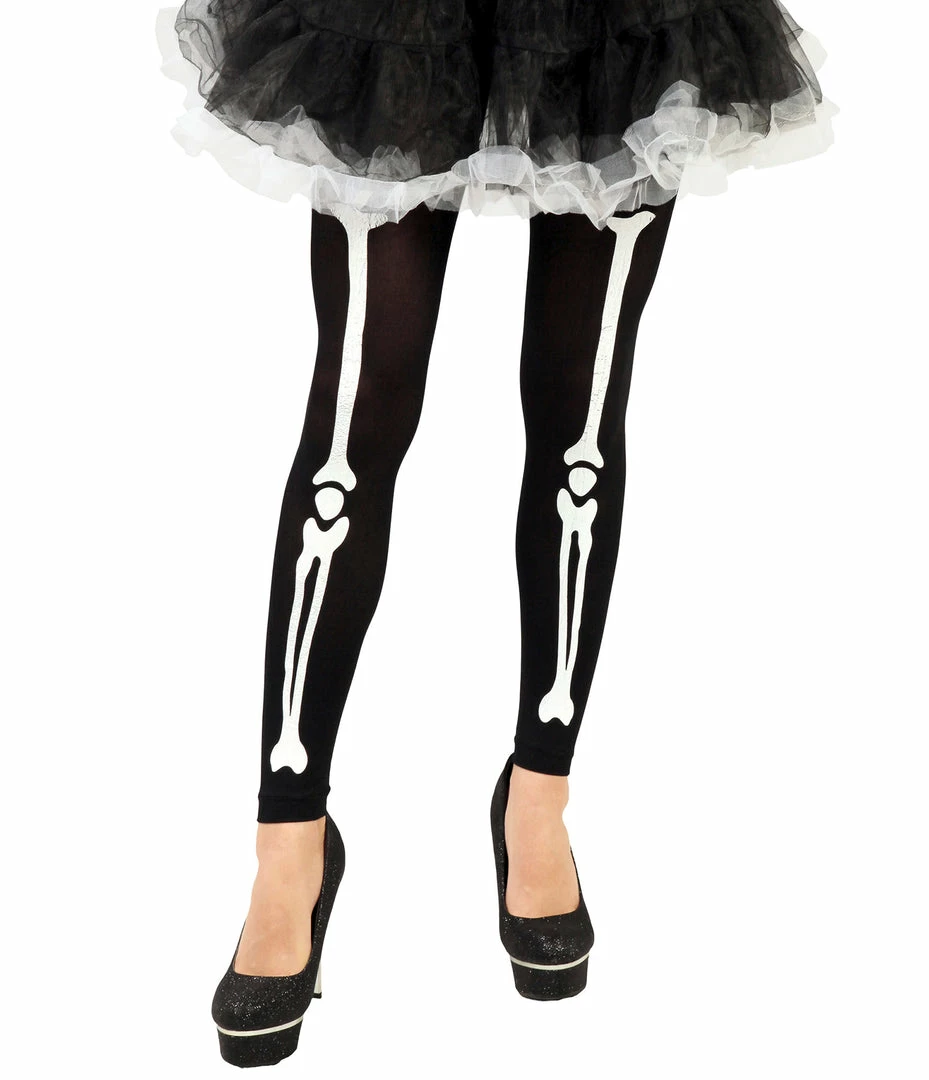 Ladies black Skeleton Bones printed footless tights. These tights are black with white print and are in one size only.