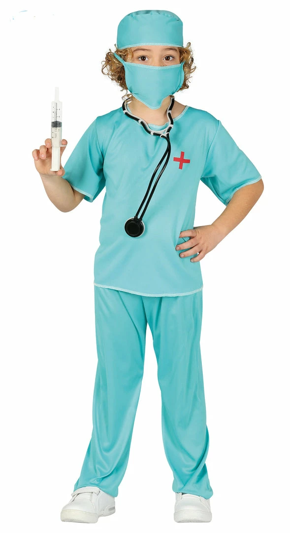 The Child Surgeon outfit includes a light blue short-sleeve top with a red printed hospital logo on the front and a matching pair of blue trousers.