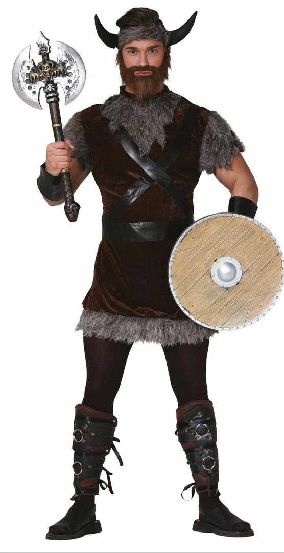 This adult Viking costume includes a fur tunic, belt, a headpiece and sleeves.