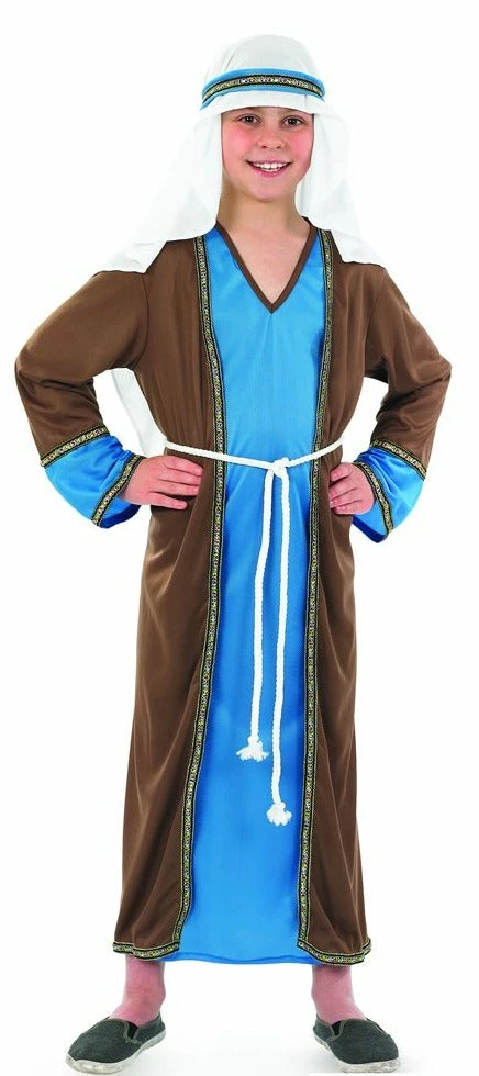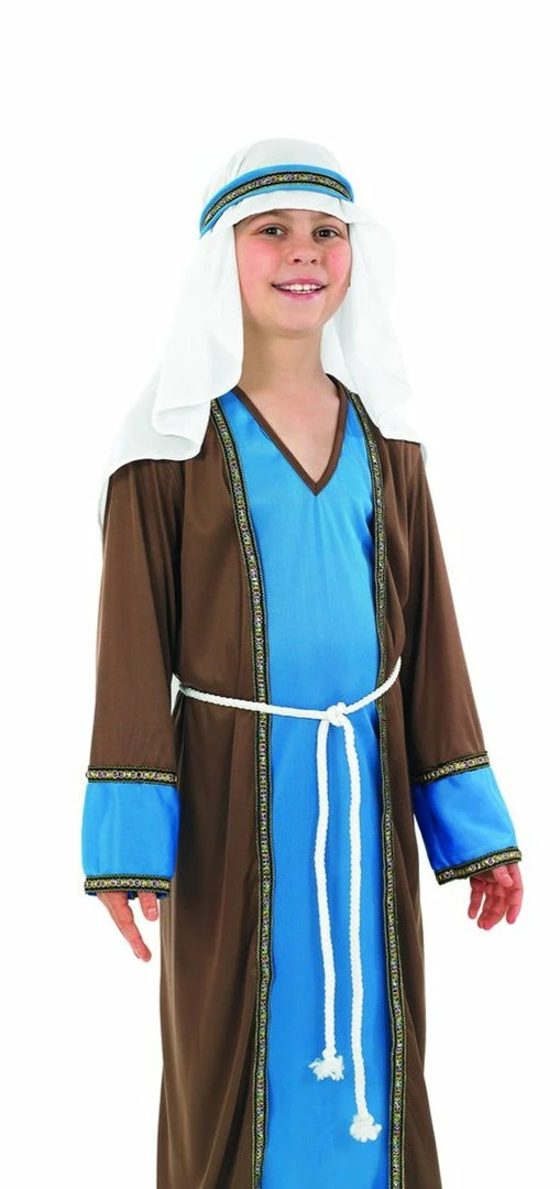 Inspired by traditional depictions of Joseph, this Boys Saint Joseph Costume is perfect for any Christmas Nativity play. Joseph costume includes a long blue v neck tunic with a brown jacket with brocade trim. Also included is a white rope belt and headpiece. Includes Blue Tunic Brown Robe Headpiece