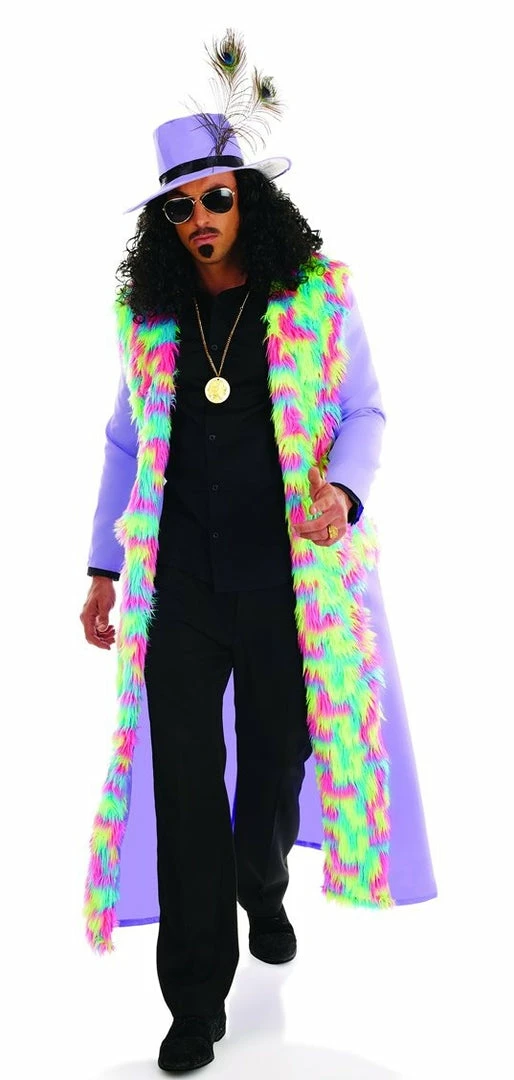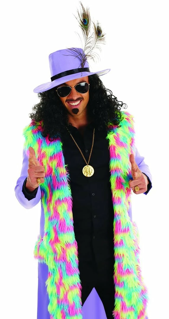 Perfect if you are going to a Pimps & Hoes themed party! Includes a long purple coat with a multi-coloured faux fur trim. To complete the outfit is a matching purple hat with a black ribbon band and a peacock feather.