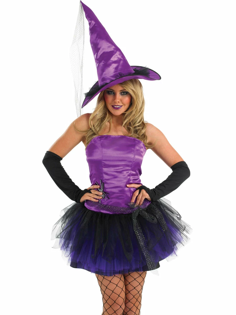 The Sexy Spider Witch Adult Costume includes purple and Black Tutu Dress, Witches Hat with Black Netting and Fingerless Gloves. As a sexy witch you have the power to mix love potions that will make you irresistible to men and cast spells that will have everyone mesmerized by your beauty. But in order to attain these powers you must wear the perfect witch costume.