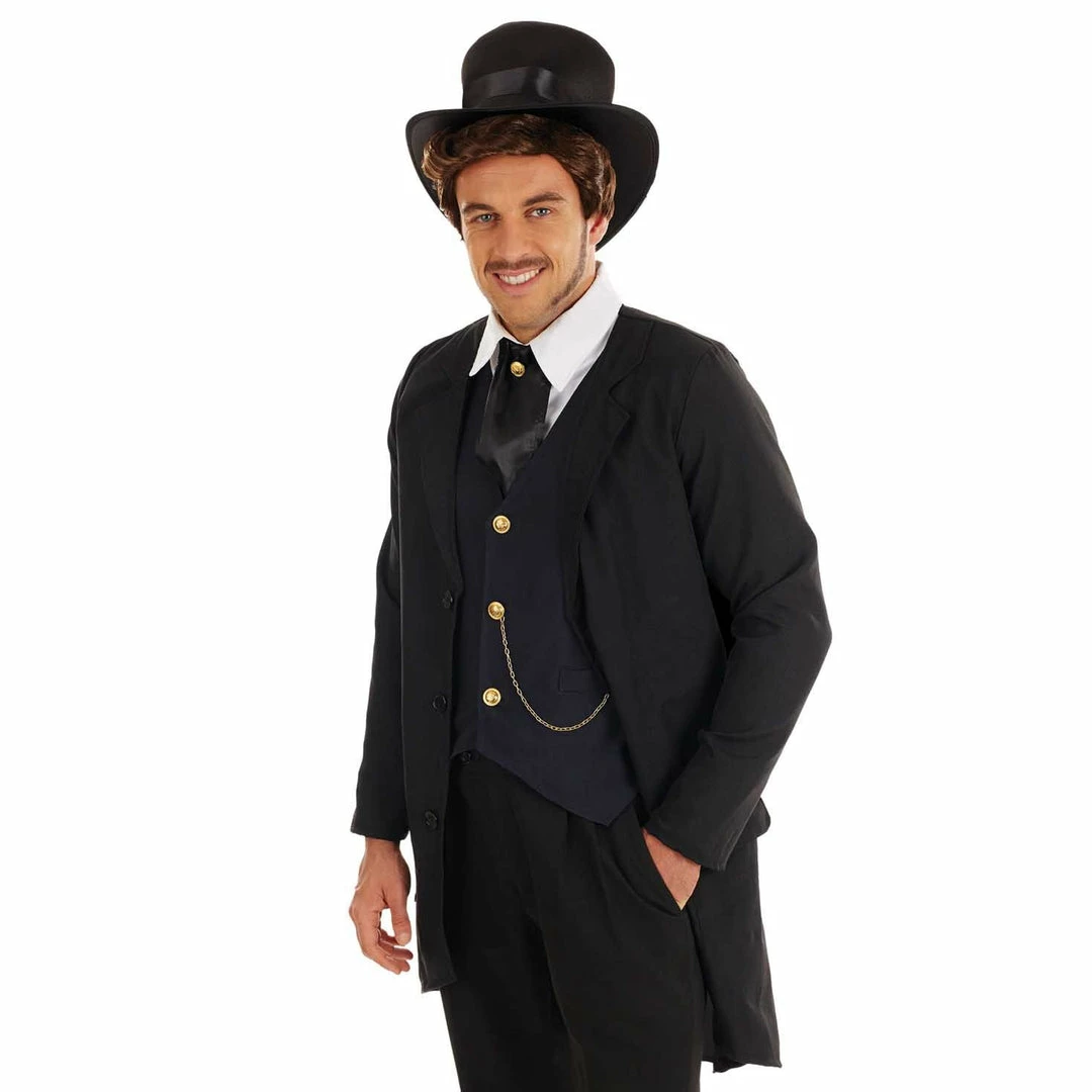 This adult Victorian suit features a black tailcoat jacket, white shirt with attached black waistcoat & gold button detail, a black cravat & signature top hat.