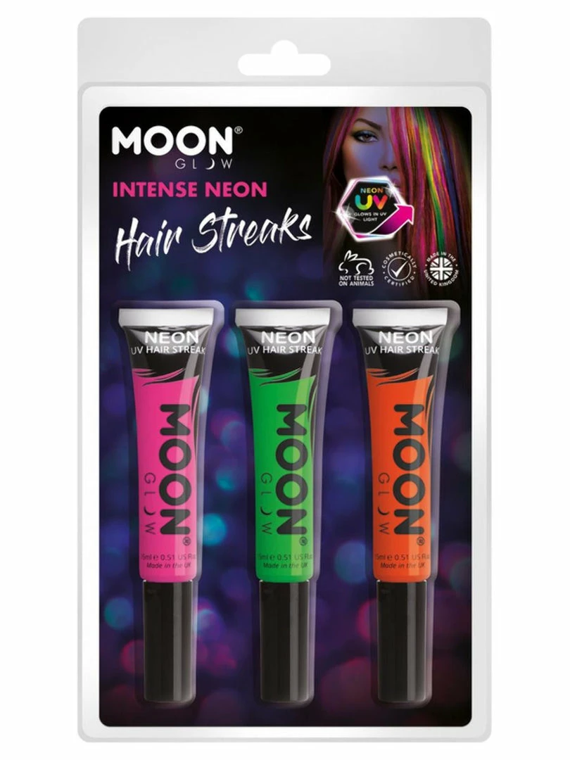 Why not add some intense vibrance to your hair with our pink, green and orange Moon Glow Intense Neon UV Hair Streaks.