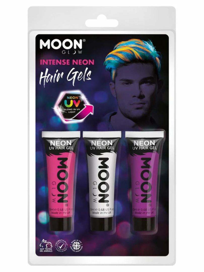 Spike and glow with our intense Moon Glow UV Neon Hair Gel Pink Green and Orange kit!