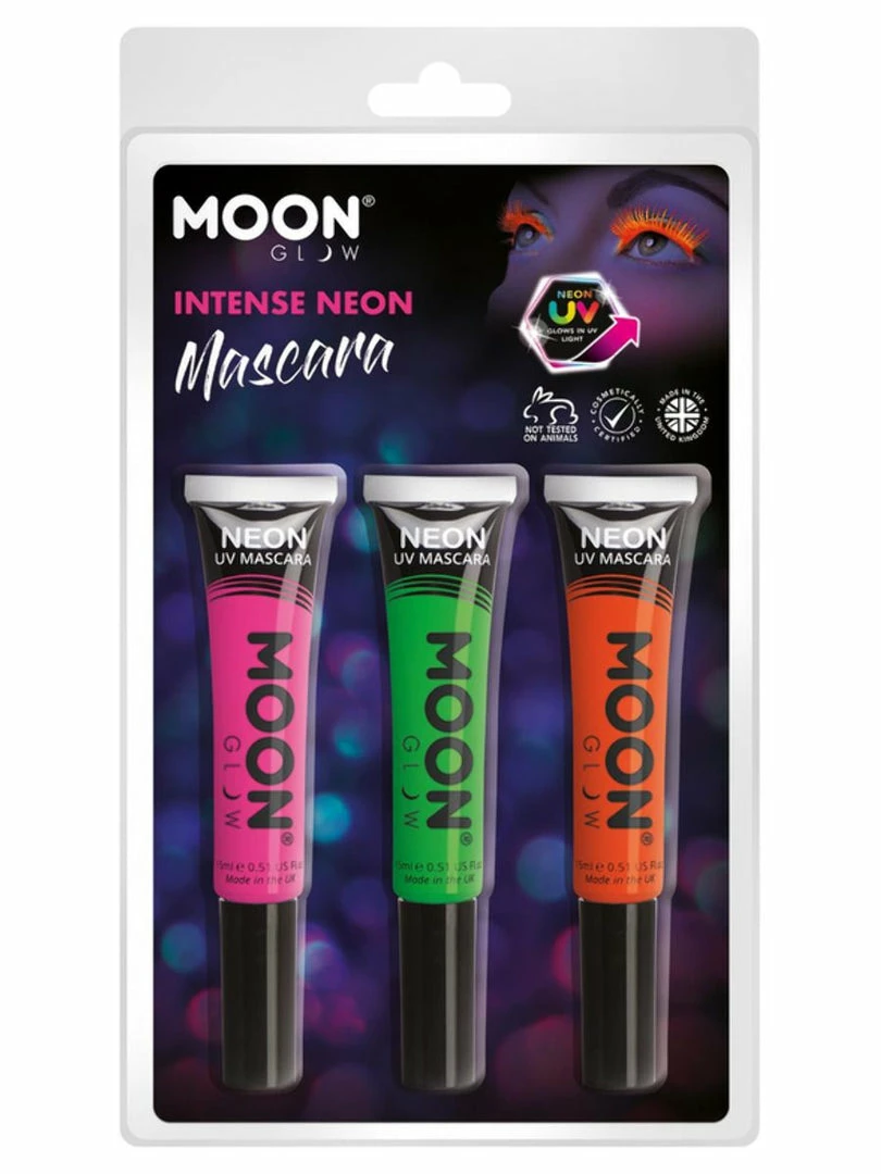 Create show stopping lashes with Moon Glow 15ml Neon UV Mascara Pink, Green and Orange set. In natural light the mascara will be a bright neon, but under UV is when they really come to life with a neon glow.