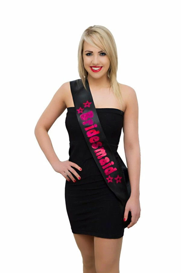 Help your Hen Party look the part with matching Hen Party Sashes. Hen Party Accessories make you stand out from the crowd whether it be Hen Party Badges, Bridesmaid Sashes or Hen Party Costumes, they are all bound to get you lots of attention. Our Bridemaids features a Black satin sash and has the words “Bridemaids” written in shimmering Hot Pink letters