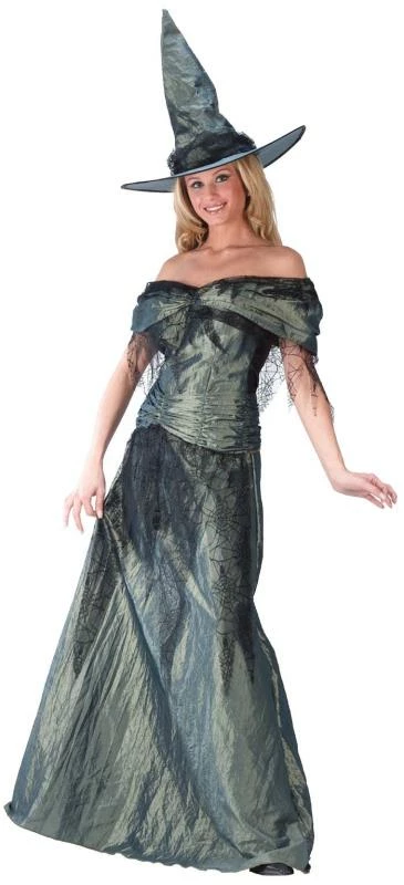 Our Emerald Witch Costume includes an elegant off-the-shoulder emerald green taffeta dress that shimmers when it catches the light.