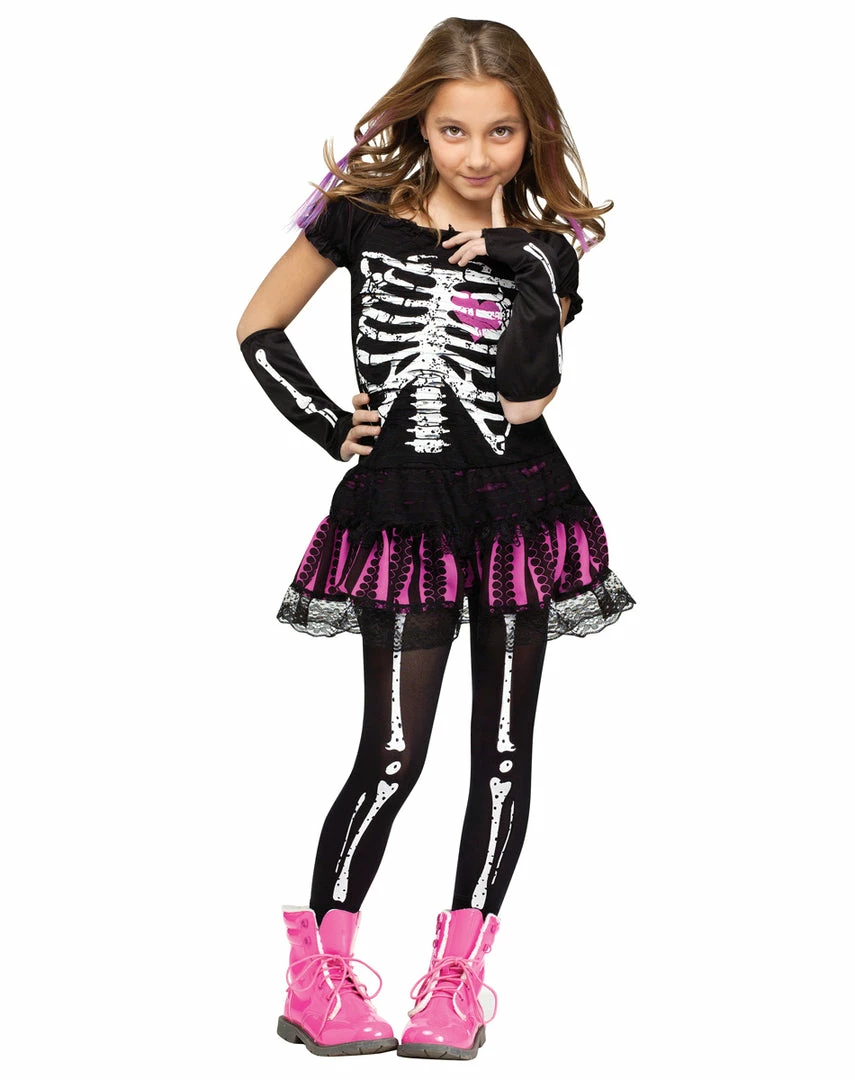 Just a touch of pink will turn scary into punk rock princess. This cute Sally Skully Kids Costume includes the cute black, white and pink skeleton costume dress, sleevelets, and the matching bone print footless tights.