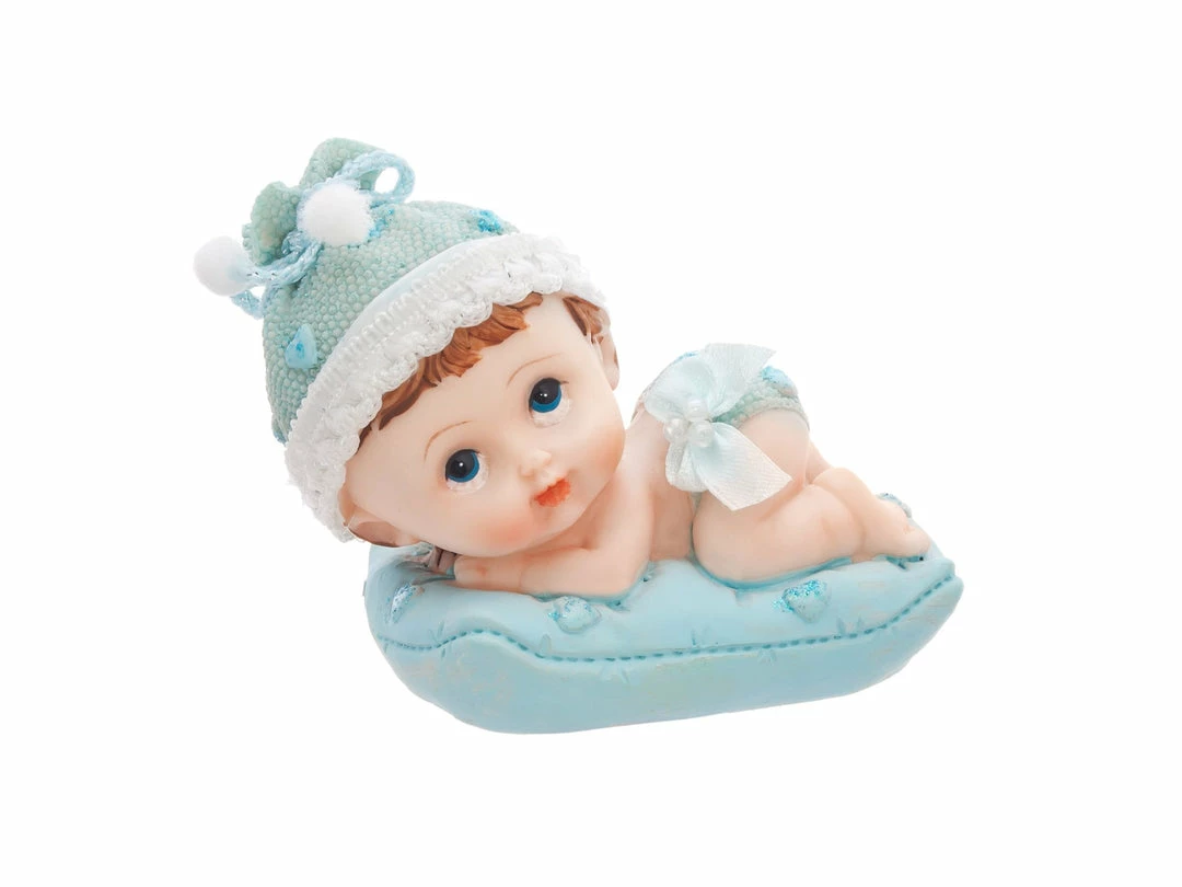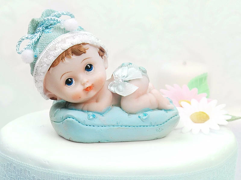 Shhh. This little baby boy is trying to sleep. This cute blue figurine features a baby boy lying on a pillow can be used as a cake topper for a baby shower or boxed for a gender reveal.