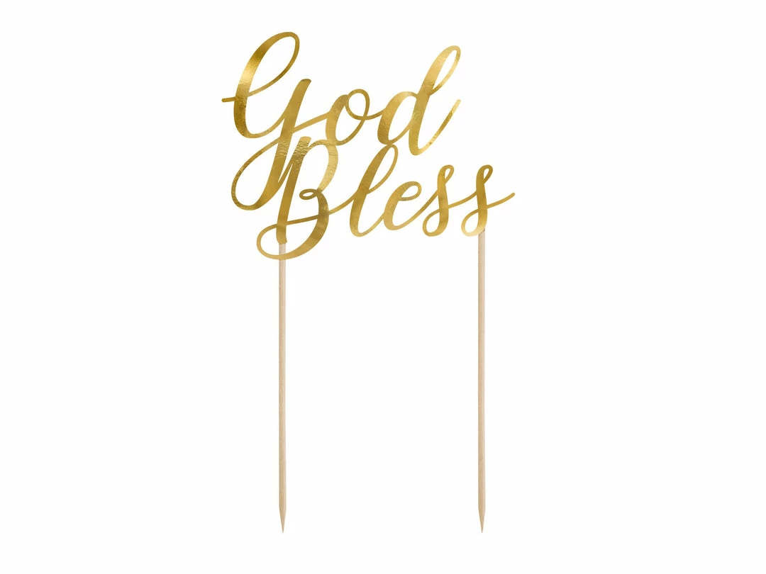 These God Bless cake topper is made of mirror gold paper. Height approx. 27.5 cm.