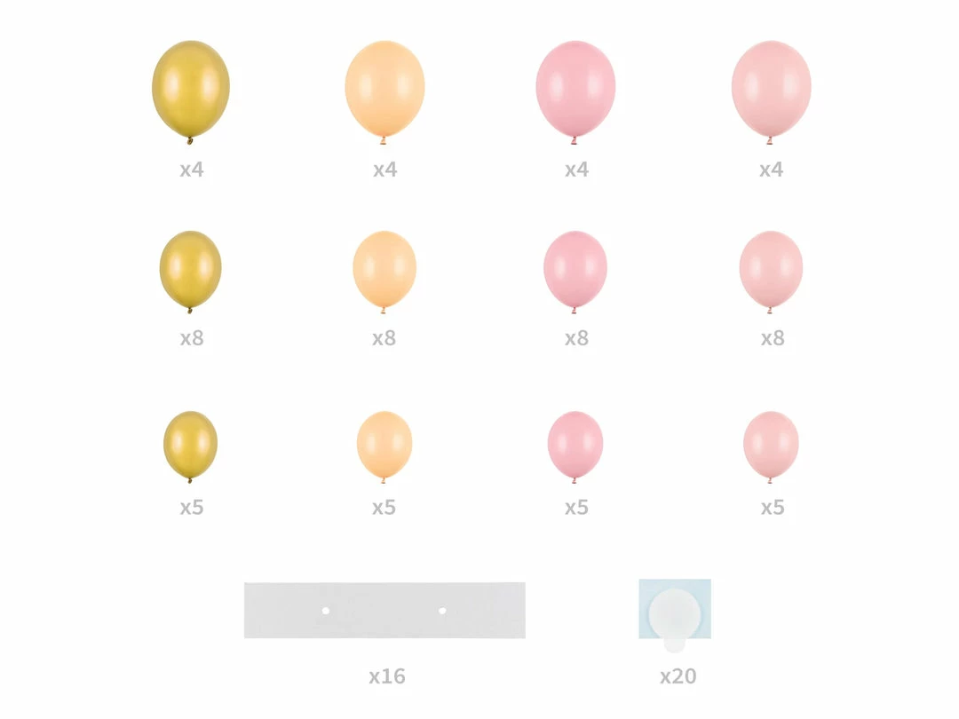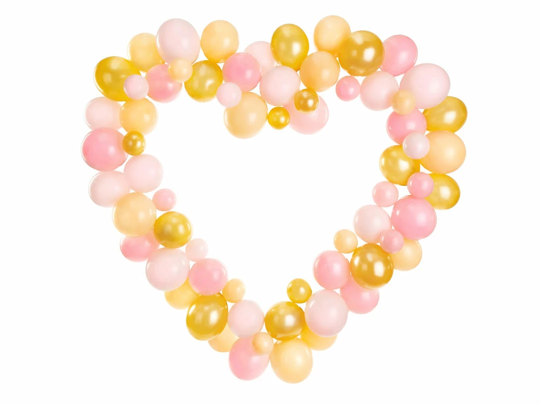 Our pink heart balloon garland set contains 68 balloons (17 pcs in Pastel Pale Pink colour, 17 pcs. in Pastel Baby Pink colour, 17 pcs. in Pastel Light Peach colour, 17 pcs. in Metallic Gold colour), 16 cardboard elements, 20 pcs double sided glue stickers, instruction. Size after folding approx. 166 x 160 cm.