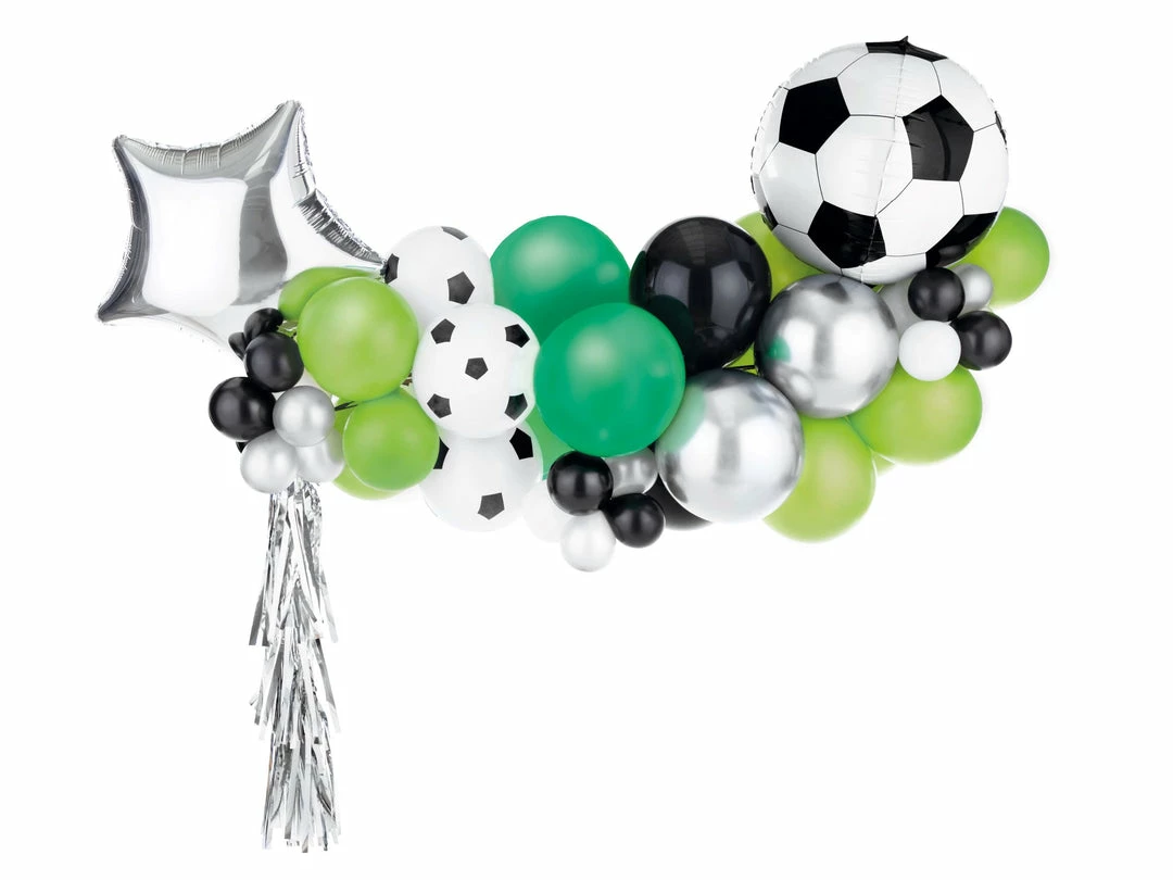 Our football themed balloon set contains: balloons (48 pcs), foil balloons (2 pcs), garland (1 piece), paper straw (1 piece), foam tape (30 pcs), modeling balloons (2 pcs) and 2.5 m of balloon garland tape. Size approx. 150 x 126 cm.