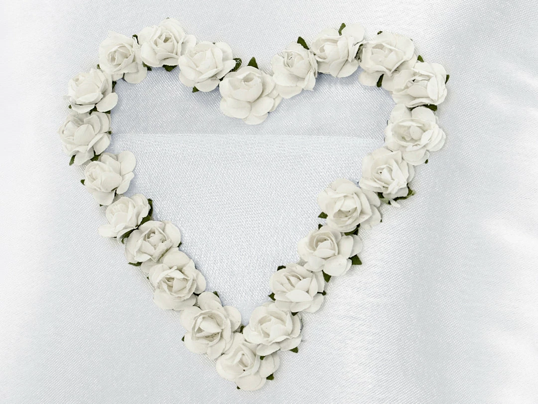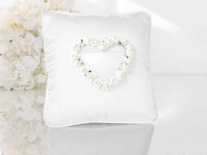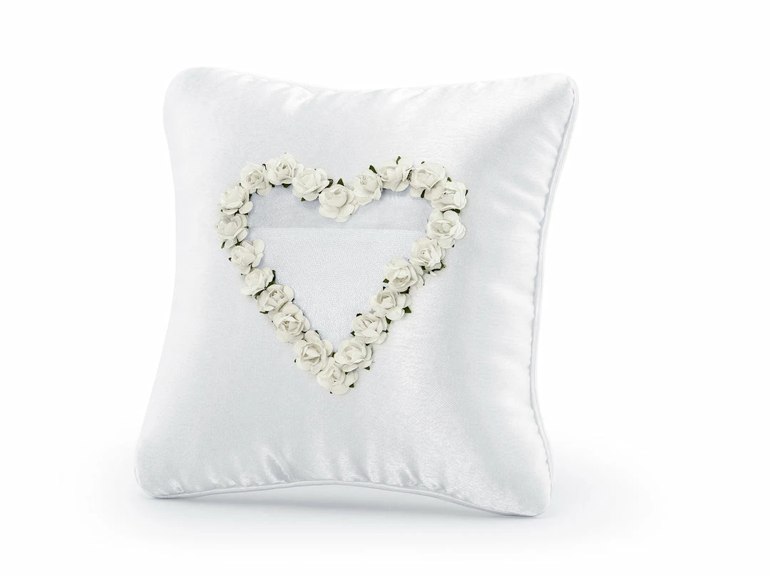 This romantic ring bearer pillow is made of white glossy satin with a heart made of white roses, with a tulle white pocket for wedding rings,