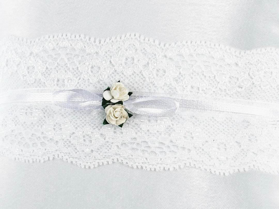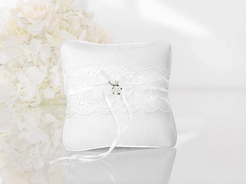 This romantic ring bearer pillow is made of white glossy satin with white lace, light pink roses and twine for wedding rings.