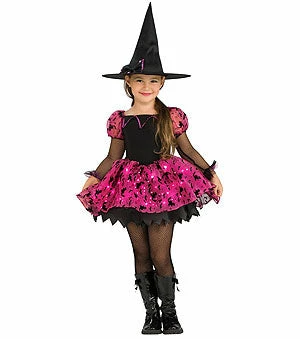 This luminous Witch Costume for girls features a black dress with tiny fiber optic lights strewn over the skirt that come on with a flip of the hidden switch (batteries included). The dress has such sweet details as a sprinkle of sequins at the neckline, sheer sleeves with ruffled openings, a zigzag hem and puff sleeves and skirt printed with sparkly cats and bats. The included tall witch hat with sequin-trimmed bow makes this an enchanting look indeed.