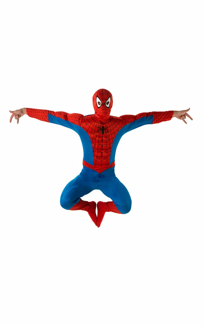 Our Officially Licensed Spiderman Deluxe Costume includes a one piece printed jumpsuit with a padded chest. And of course Spiderman’s trademark mask fabric overhead mask.